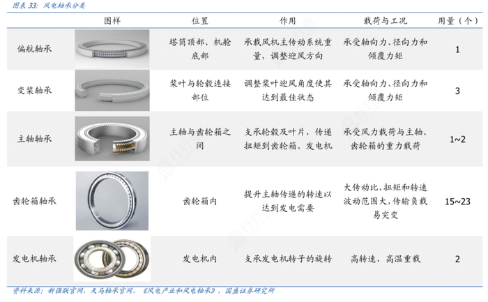 公开资料显示,风电轴承一般包括变桨轴承、偏航轴承、传动系统轴承(主轴轴承、齿轮箱轴承)。风电轴承在不同机型中的使用量不同,一般来说一台直驱式风机需要1~2套主轴轴承、1套偏航轴承、3套变桨轴承,而双馈式或半直驱式风机由于在直驱式的基础上增加了齿轮箱,因此还需要多套齿轮箱轴承。