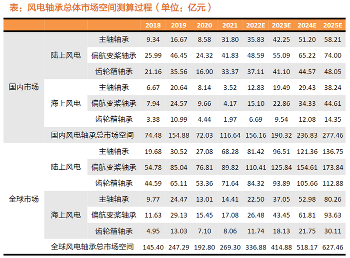 天风证券李鲁靖6月17日研报中表示,将主轴轴承、偏航变桨轴承、齿轮箱轴承和发电机轴承的市场空间相加,近似计算出风电轴承领域的总市场空间。2021年全球市场空间269.3亿元,预计2025年627.46亿元,CAGR为23.55%。