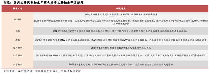 具体来看,新强连作为国内风电轴承龙头,2020年,公司成功试制7MW直驱式双支承单列圆锥滚子主轴承;2022年7月27日,公司“12MW 海 上抗台风型主轴承”成功下线。目前,公司具备7-12MW无软带圆锥滚子轴承生产能力,可为海上风电提供主轴承产品。