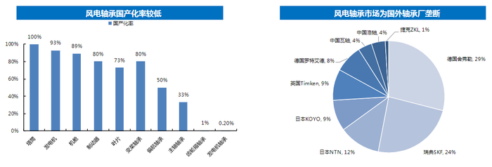 国泰君安证券徐乔威5月6日研报中表示,国产轴承多为低端的变桨轴承,价值量较低,我国高端轴承市场被瑞典SKF、德国舍弗勒、日本NTN、日本KOYO、美国Timken等“轴承八大家”厂商垄断,2019年舍弗勒、SKF、NTN的全球市占率分别达29%、24%、12%,市场竞争格局集中,而国内企业洛轴、瓦轴、新强联等所占市场份额不足10%。