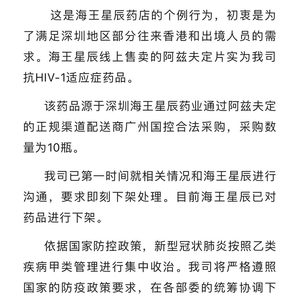 真实生物表示,这是海王星辰药店的个例行为,初衷是为了满足深圳地区部分往来香港和出境人员的需求。海王星辰线上售卖的阿兹夫定片实为公司抗HIV-1适应症药品。