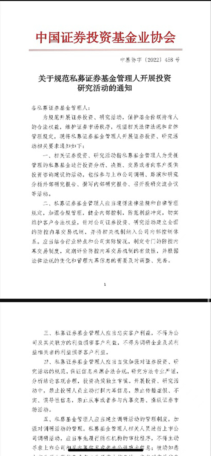 业内人士表示:“大多数私募机构内部合规很少重视内部调研纪要的管理与隔离,此次中基协下发通知规范投资调研活动,有助于行业健康可持续发展,也避免调研纪要的流出扰动市场。”