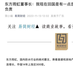 近日,据媒体报道,“易简财经”微信公众号发布了一则东方雨虹删减版的调研纪要。这份纪要称,东方雨虹董事长李卫国已经回国,并表示回来争取将公司做到2000亿元市值,明年目标保持20%收入增长,70%利润增长,55亿的净利润。李卫国还透露“东方雨虹要裁员1000人”。对于此份调研记录,东方雨虹相关人士已向媒体辟谣,称调研纪要内容为虚假信息。