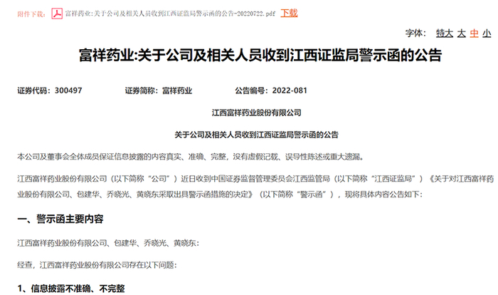 今年年初,因涉新冠药物中间体概念,市场上一度流传着一份假的《富祥药业董事长交流纪要》,称富祥药业向辉瑞等公司供应新冠药物中间体。此后,公司连续两日涨停,但未及时对消息进行澄清。7月该公司收到了江西证监局警示函,称其未及时澄清对公司股价产生较大影响的媒体传闻。