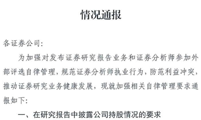 今年8月,中国证券业协会也向行业内的各证券公司下发情况通报,提出强化三点自律管理要求:一是在研报中披露证券公司持股情况,且在研报发布后两日不得进行相反交易;二是规范调研纪要管理,不得对外发布或提供给客户;三是加强对分析师参加外部评选的管理,报名后出现负面情况的应及时告知主办方并退出参评。