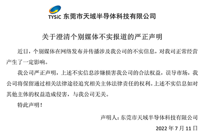 比如,今年7月,一份“碳化硅交流纪要”在多个股吧论坛、炒股社区广泛传播,以一问一答的形式“包装”成对天域半导体高管的产业访谈,其中提及了多家上市公司。7月11日午间,天域半导体便通过官网发布严正声明,称个别媒体在网络上发布并传播涉及公司的不实信息,对公司正常经营产生了一定影响。