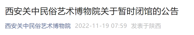 西安关中民俗艺术博物院于2022年11月19日起暂时闭馆,恢复开放时间另行通知。已经购票的游客朋友,可通过原购票渠道申请退款。