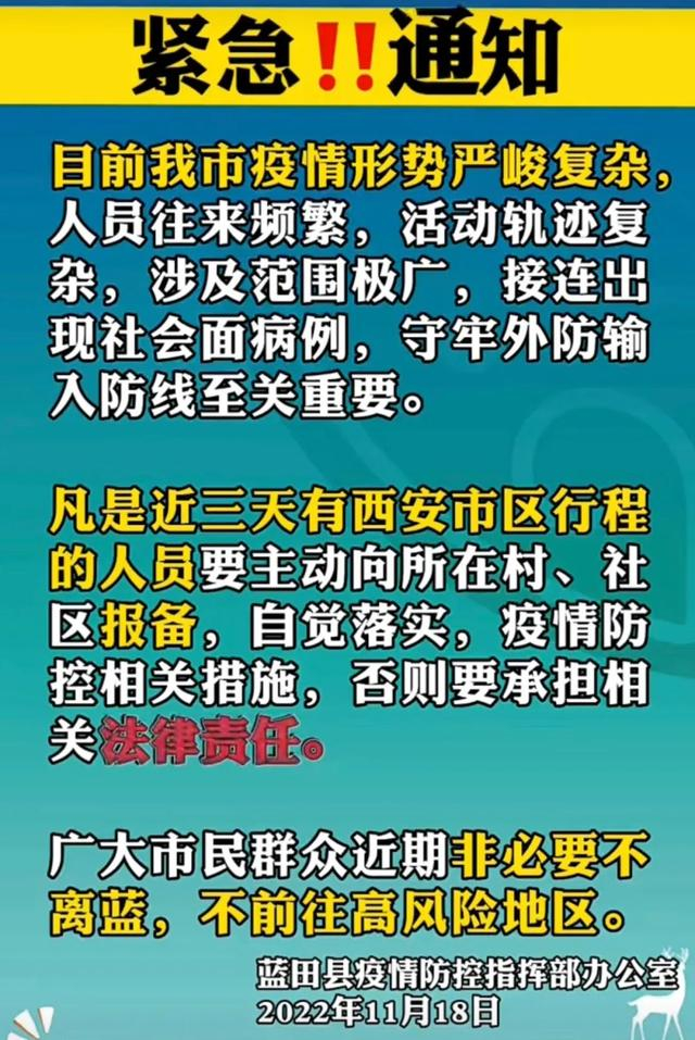 凡是近三天有西安市区行程的人员要主动向所在村、社区报备,自觉落实,疫情防控相关措施。否则要承担相关法律责任。