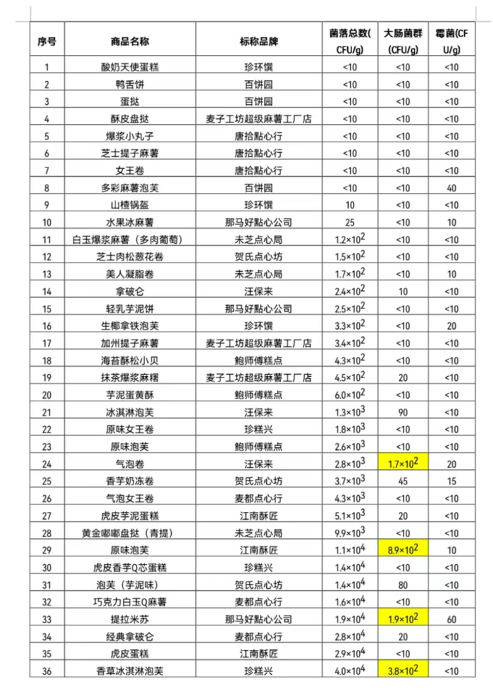 测试结果显示,“汪保来”气泡卷、“那马好點心公司”提拉米苏、“珍糕兴”香草冰淇淋泡芙、“江南酥匠”原味泡芙4款样品的大肠菌群超过国家标准规定的大肠菌群最大限量值(大肠菌群≤100CFU/g)。