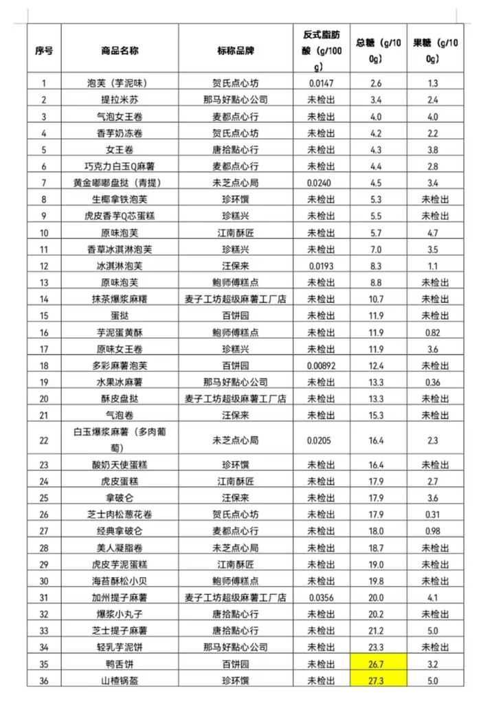 本次比较试验中有6款样品检出含有反式脂肪酸,含量在0.00892-0.0356g/100g之间,其中泡芙3款、麻薯2款和盘挞1款,如按照每人每天食用100g产品计算,均未超过建议摄入限量。