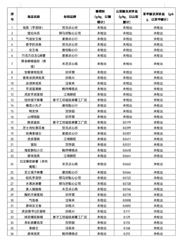 本次比较试验根据GB 2760-2014《食品安全国家标准 食品添加剂使用标准》,对36件新式点心中的糖精钠、山梨酸及其钾盐、苯甲酸及其钠盐3个项目进行测试,其中山梨酸及其钾盐和苯甲酸及其钠盐为防腐剂,能抑制微生物的生长繁殖,防止食品腐败变质从而延长保质期。