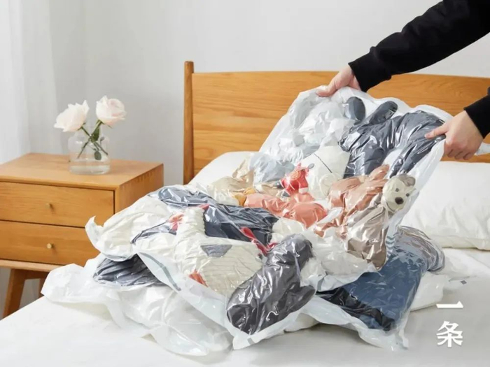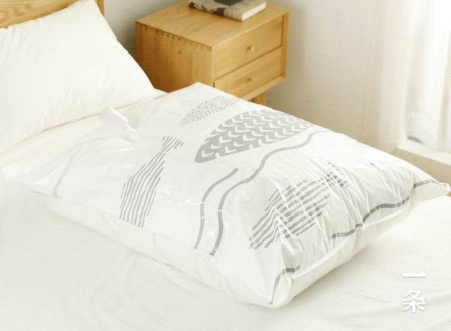 真空袋可以帮你轻松压缩家里被褥、衣服等比较蓬松又占地方的物体,解放更多的收纳空间。