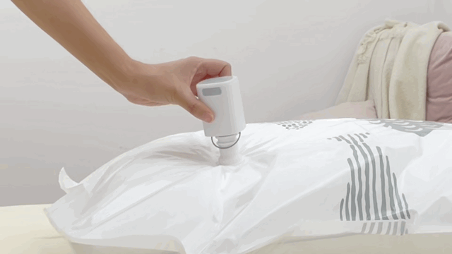 把抽气头怼到真空袋的气阀上,就可以让原来欠收拾的被子,收拾到不再膨胀的样子。