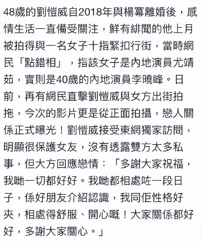 11月18日深夜,港媒报道称刘恺威在接受采访时亲口承认和李晓峰的恋情。