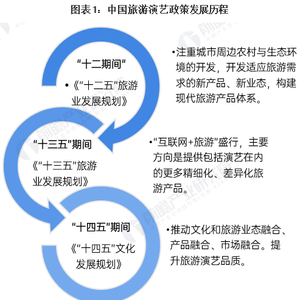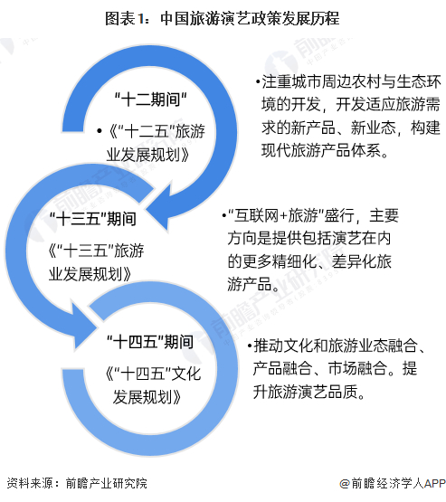 旅游演艺政策在十四五之前并未有相关政策重点提及。“十二五”期间旅游业方式发展粗放、旅游产品供给不足、产业结构失调、管理体制不顺而备受诟病,但此时现代旅游体系出现雏形。“十三五”期间有了明显的改善,“互联网+旅游”盛行,主要方向是提供包括演艺在内的更多精细化、差异化旅游产品。“十四五”期间政策上大力支持旅游演艺产品、业务、服务、市场参与者的发展,《“十四五”文化发展规划》中提及推动文化和旅游业态融合、产品融合、市场融合,提升旅游演艺品质。至此,旅游演艺在政策上得到国家层面的鼓励。