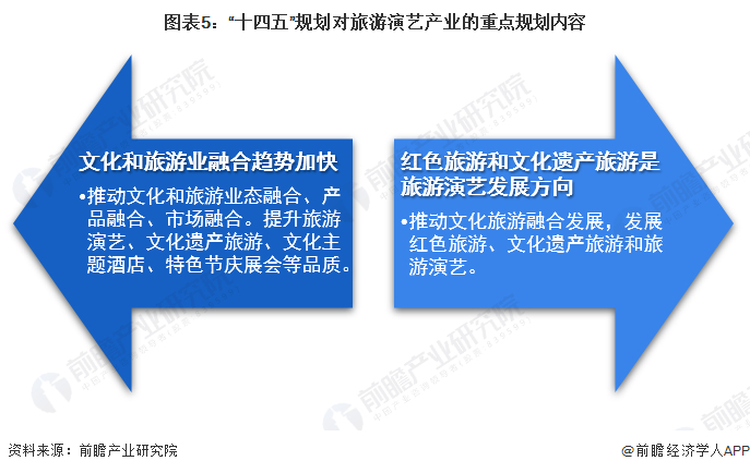 旅游演艺发展规划中有两个重要文件,一是《“十四五”文化发展规划》,《规划》提出要提升旅游演艺、文化遗产旅游、文化主题酒店、特色节庆展会等品质,支持建设集文化创意、旅游休闲等于一体的文化和旅游综合体;二是《“十四五”旅游业发展规划》,提出到2025年,旅游业发展水平不断提升,现代旅游业体系更加健全,旅游有效供给、优质供给、弹性供给更为丰富,大众旅游消费需求得到更好满足。两个文件诠释了文旅业结合趋势以及红色旅游、文化遗产旅游是旅游演艺的发展方向。