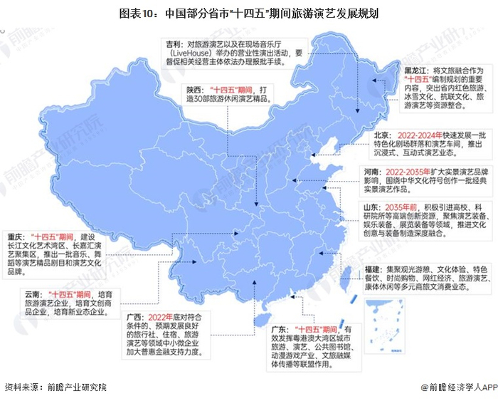 从各省市的旅游演艺发展规划来看,大部分省份对2025年旅游演艺产业并未硬性指标。各地开始着力发展细分产业的旅游演艺,如黑龙江进行冰雪文化、红色旅游、旅游演艺等资源整合;北京2024年前发展一批特色演艺车间;河南2035年前扩大实景演艺品牌影响;山东2035年前积极聚焦文化创意于装备制造的深度融合;重庆“十四五”期间建设演艺精品剧目;广东发展粤港澳大湾区城市旅游等。