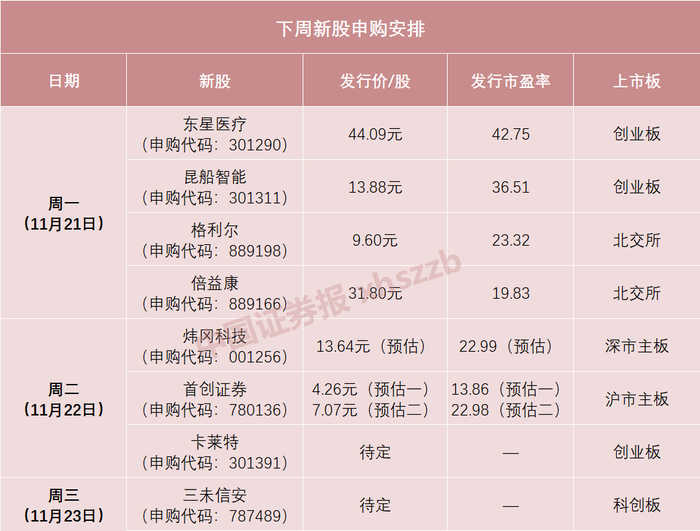 根据新股发行安排,下周有8只新股申购,包括创业板新股3只、科创板新股1只、北交所新股2只、沪深主板新股各1只。