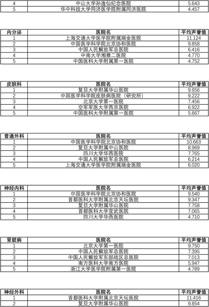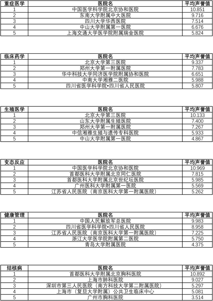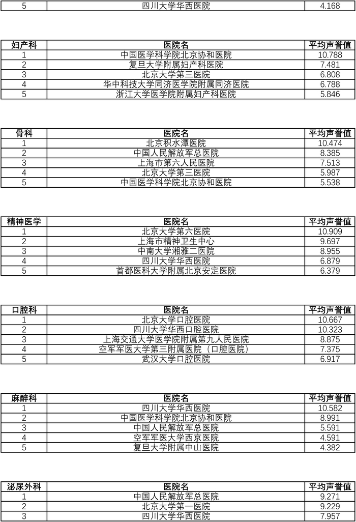 从复旦版《2021年度中国医院专科声誉排行榜》来看,北京协和医院病理科、放射科、风湿病、妇产科、普通外科、神经内科、核医学、急诊医学、重症医学、变态反应,复旦大学附属华山医院感染科、皮肤科和康复医学,复旦大学附属眼耳鼻喉科医院眼鼻喉科,复旦大学附属儿科医院小儿内科,复旦大学附属中山医院全科医学,瑞金医院内分泌,上海仁济医院消化科,上海第九人民医院整形外科,广州医科大学附属第一医院呼吸科,北京积水潭医院骨科,北京大学口腔医院口腔科,四川大学华西医院麻醉科,中国人民解放军总医院泌尿外科,阜外医院心血管病和心外科,北京大学第一医院肾脏病,中国医学科学院肿瘤医院胸外科和肿瘤学,中国医学科学院血液病医院血液科等,均位列各专科榜单第一。