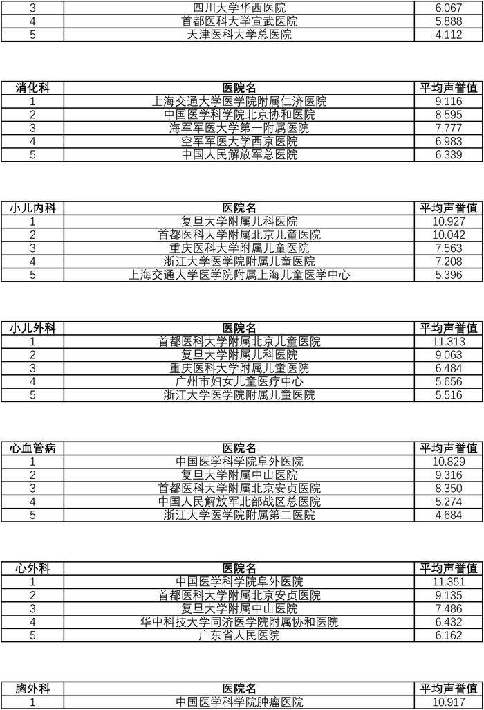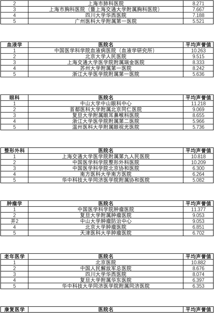此外,复旦大学附属肿瘤医院病理科,浙江大学医学院附属第一医院传染感染,北京同仁医院耳鼻喉科,中日友好医院呼吸科,复旦大学附属妇产科医院妇产科,上海市精神卫生中心精神医学,复旦大学附属华山医院神经外科、复旦大学附属儿科医院小儿外科,复旦大学附属中山医院普通外科和心血管病,复旦大学附属肿瘤医院肿瘤学,瑞金医院烧伤科,上海市肺科医院胸外科、北京同仁医院眼科等,均位列专科榜单第二。