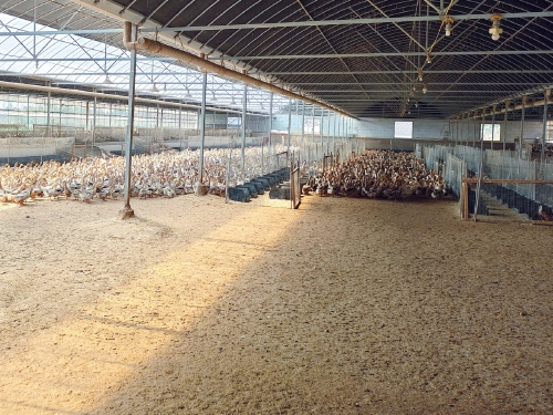 浙江省金华市金婺农业发展有限公司在进行蛋鸭养殖时使用发酵垫料技术进行养殖粪污资源化利用,将益生菌掺入秸秆、锯末、谷壳等垫料中后铺设到鸭舍,不仅能有效利用鸭子产生的粪便,益生菌发酵还能有效改善鸭舍空气质量。同时,定期铲除的发酵垫料也成为种植户喜爱的有机肥料,实现了种养结合、资源再利用。图为浙江金婺农业发展有限公司铺设垫料的鸭舍。 农民日报·中国农网记者 杨惠 摄