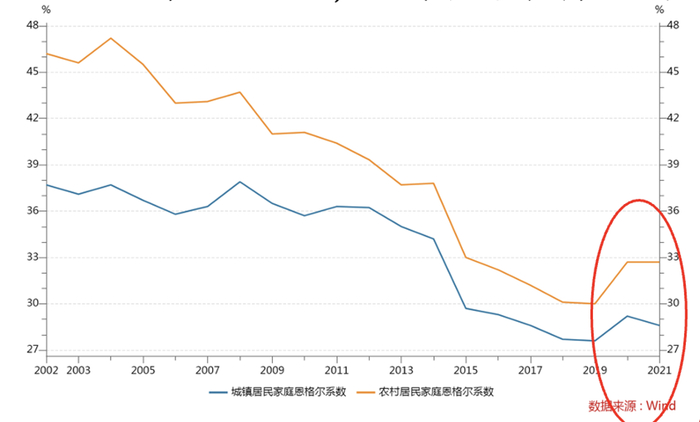 疫情发生后无论是城镇还是农村恩格尔系数都有明显上升,城镇从27.6%上升到29.2%,农村是从30%上升到32%,基本上回到了2016年左右的水平。最新2021年的数据显示,城镇恩格尔系数有小幅回落,但仍然高于疫情前;农村则和2020年持平。