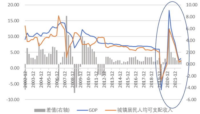 相比于收入的绝对水平,我们还要看它的相对水平,即相对于GDP的增速。蓝色线是GDP增速,橙色是城镇居民人均可支配收入变化,灰色柱状图是GDP减去人均可支配收入增速的变化。在2013年之后,除了2020年3月这一个月,居民收入的增速持续低于GDP增速,这在经济不是很好的时候就会形成一个特别差的恶性循环。循环怎么发生?低增长,低增长背景下收入增长更低,导致居民有弱预期弱消费,由此进一步强化了低增长的故事。