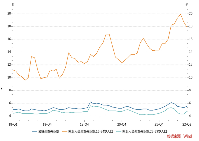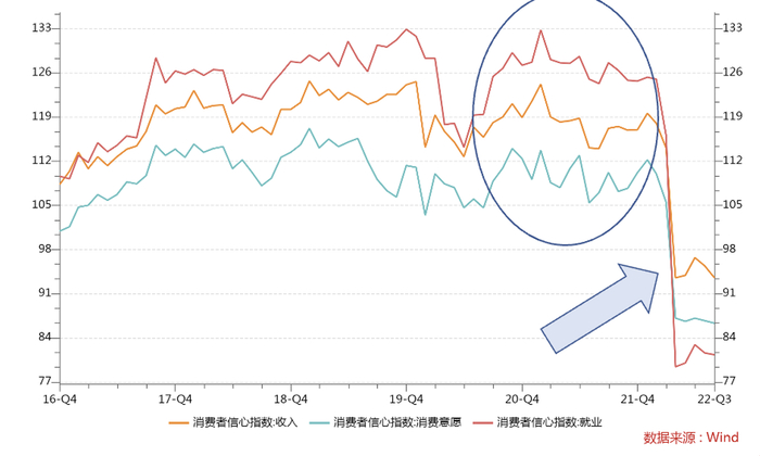 下图这三条线分别是消费者对收入、消费意愿和就业的信心指数。可以看到,在疫情之后,有一段时间,2020年-今年一季度,整体看消费者信心还处在较高水平,和疫情发生前没有显著差异。但从今年一季度末,居民信心开始直线下降,下降最多的是红色这条线,即消费者对就业的信心,从三月份的116%大幅下降到四月份的79%。
