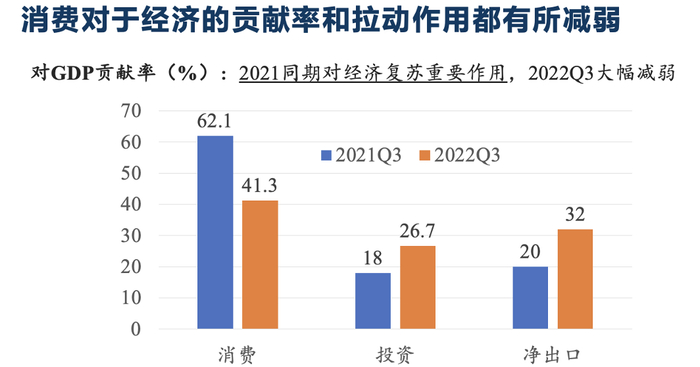 消费疲弱的自然结果是对经济的贡献率和拉动作用有所下降,橙色是今年前三季度三大需求对于GDP的贡献率,蓝色是去年同期2021年前三季度需求对GDP的贡献。去年同期消费对GDP贡献率高达62%,消费对于去年的经济复苏起到了非常重要的作用,但是今年消费对GDP的贡献率大幅下降到了41%,相应地,投资和进出口对GDP的贡献率都在往上走。