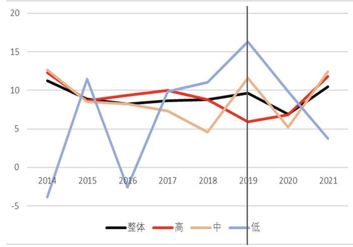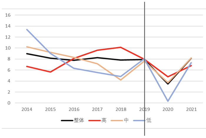 再看农村。农村表现的形式又不一样,最大的问题是低收入组的变动趋势很不容乐观,可以看到在疫情发生后直线下降,目前仍没有得以扭转。相比之下中高收入组从2020年开始增速已经回升。