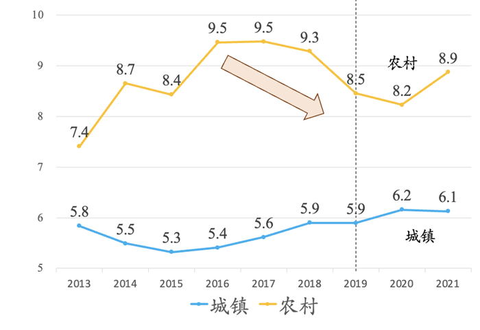 说完增速再看看收入绝对水平的比较。我们用来考察收入差距的指标,就是最高20%收入户的收入除最低20%收入户的情况。黄色的是农村,蓝色的是城镇,疫情后无论是城镇还是农村的收入差距都在扩大,尤其是农村,由疫情前的8.5%上升到了8.9%。还有一点,疫情打断了此前从2016年开始农村收入分配在改善的大趋势。