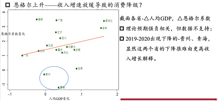 为什么我们要先讨论恩格尔系数?因为这一指标经常被用来观察消费是升级还是降级,由此衍生出一个讨论:疫情后中国是否由于增速收入放缓而出现了整体的消费降级?要回答这一点,如果认为收入是主要的因素,那么,把各省放在一起,横轴是人均GDP变化,纵轴是恩格尔系数的变化,理论上应该是显著的负相关关系,即收入增长更快恩格尔系数下降更快。但结果并不是,相反是比较强的正相关系数,也就是说在解释恩格尔系数上升时,收入的解释力并没有那么强。如果观察2019年-2020年,尽管大部分省份的恩格尔系数都在上升,但还有两个省份出现了恩格尔系数出现了下降,分别是贵州和青海,显然这两个省的恩格尔系数下降很难由他们更高的收入增长来解释。