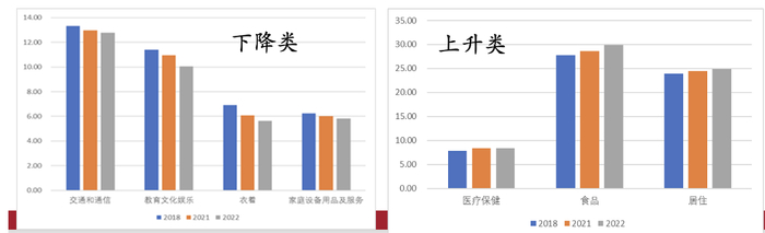 讲完恩格尔系数之后,我们再看统计局八大类消费品,因为“其他类”我们不太明确主要是什么,我们重点比较这剩下的七大类。见下图。灰色柱状图是今年前三季度的数据,蓝色是疫情前2018年的数据,橙色是2021年的数据,消费占比下降主要有四大类:交通通信、教育文化娱乐、衣着、家庭设备用品及服务。这四类中交通通信、教育文化娱乐、衣着都是跟消费场景受限以及社交半径缩小直接相关的,这个家庭设备及服务主要跟房地产的下行有关。上升的有什么?有三大类,一类是医疗保健,还有食品,这跟前面恩格尔系数上升是一致的,此外还有居住。