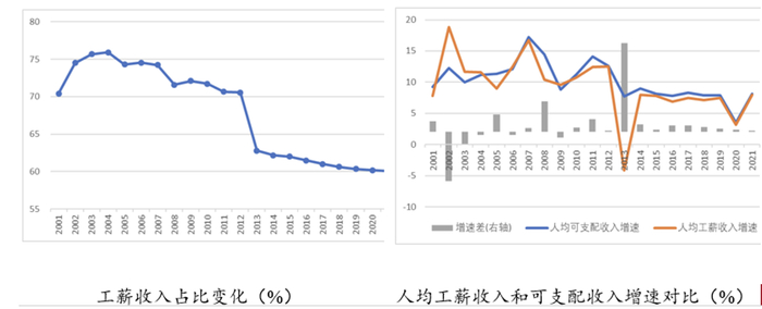 再看工薪收入。我们借用一个词“压舱石”,工薪收入完全可以说是城镇居民可支配收入中的“压舱石”,常年占到六成以上。这个“压舱石”今年的表现是既有近忧,也有远虑。近忧是指当前严峻的就业形势,远虑是指长期来看我们发现工薪收入这块压舱石越来越压不住了,并且跑不动了。
