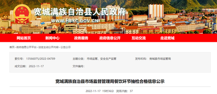 中国质量新闻网讯 2022年11月17日,河北省宽城满族自治县人民政府网站发布《宽城满族自治县市场监督管理局餐饮环节抽检合格信息公示》,涉及52批次样品。合格信息如下: