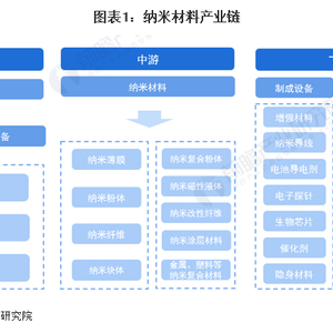 产业链中游环节为纳米材料的生产制备,包括纳米粉体、纳米薄膜、纳米纤维、纳米块体,还包括以此加工形成的纳米复合粉体、纳米磁性液体、纳米涂层材料、纳米改性纤维及金属/陶瓷/塑料基等纳米复合材料。