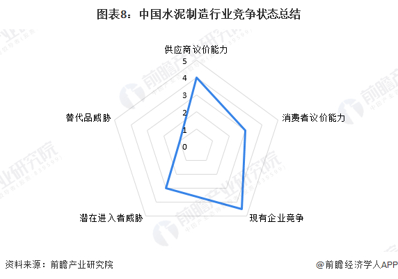 根据以上分析,对各方面的竞争情况进行量化,5代表最大,0代表最小,目前我国水泥制造行业五力竞争总结如下: