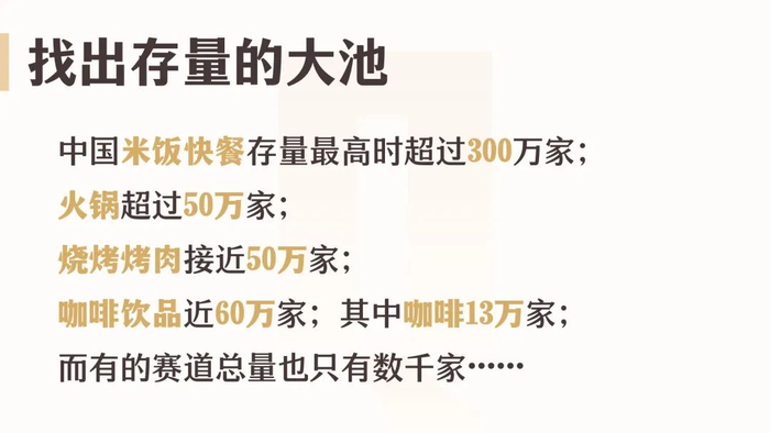 很多资本都喜欢投资快餐品类,因为快餐整个赛道的存量最高的时候超过300万家,哪怕遇到疫情现在也有200多万家。火锅赛道也会出现很多非常优秀的创业者,火锅赛道整个的营收规模接近六千亿,火锅赛道的门店数也超过50万家。烧烤赛道也是接近50万家,咖啡饮品加起来也接近60万家,其中光咖啡一个单品就高达13万家。