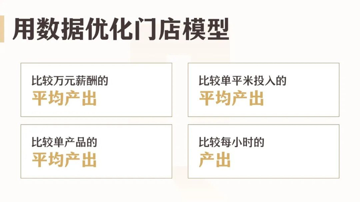 在不同的地方,单平米的租金成本是不一样的。一方面是降低面积,另一方面把你原来的租赁的地方,尤其很贵的地方,放到社区,放到三四五线城市进行下沉,也是提高坪效的方式,我们观察到大部分连锁品牌越是下沉坪效就越高。包括减少单平米的装修也是提高坪效的方式,所以你对比你的同行之后,你的坪效是否更高。