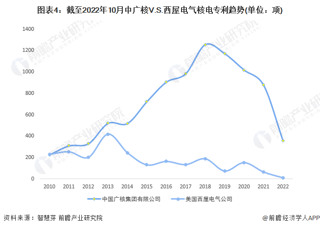 从趋势上看,2010-2022年10月,中广核在核电领域专利申请量每年均比西屋电气多,2018年两者核电专利申请量相差更是高达6倍左右,分别为1256项和190项。