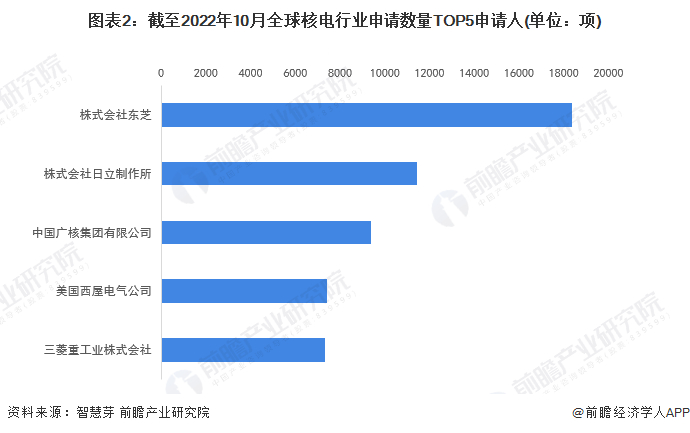 根据智慧芽数据,全球核电行业专利申请数量TOP5申请人分别是株式会社东芝、株式会社日立制作所、中国广核集团有限公司、美国西屋电气公司、三菱重工业株式会社。其中中国广核集团有限公司与美国西屋电气公司分别为中美两国上榜的龙头企业。