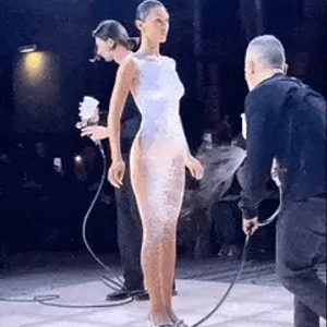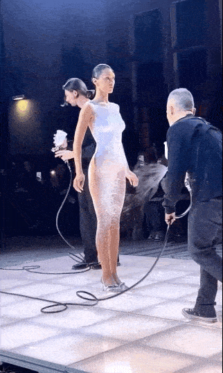 超模Bella Hadid穿着裸色丁字裤,双手捂着胸部,缓缓走向黑色的T台中央,几位工作人员手持喷制工具,像喷漆一样将白色的液体喷在Bella身上。