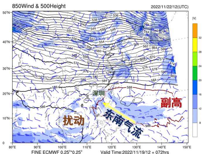 △扰动、副高、东南气流位置示意图