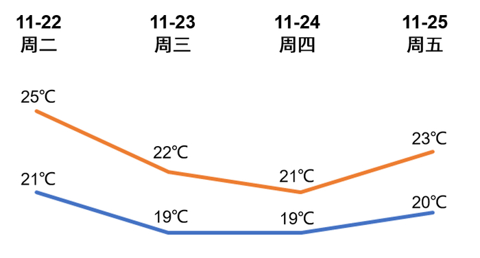 25日:阴天间多云,有阵雨,气温20-23℃。