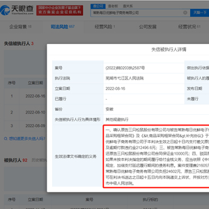 风险信息显示,常熟每日优鲜公司多次因买卖合同纠纷被起诉。多份判决书显示,该公司被判返还杭州味全食品有限公司上海分公司、四川新派餐饮管理有限公司等多家公司货款数万元至数百万元不等。目前,该公司存在多条失信被执行人、限制消费令、终本案件信息,未履行总金额超1065万元。