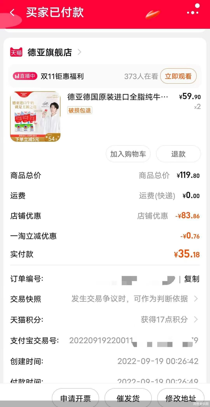 11月21日,南先生(化名)告诉北京商报记者,自己今年9月在德亚官方旗舰店下单了两箱特价牛奶,直到今天订单仍未发货。订单详情显示,南先生购买的两箱牛奶总价119.8元,叠加优惠后实际共35.18元。在小红书、微博、黑猫投诉等平台上,也有多名消费者反映遇到了同样的问题。