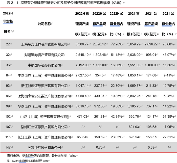 公募牌照申请获批较少,中小券商权益规模条件或难满足。以总部部门或资管子公司申请牌照,是解决资管业务规模发展瓶颈最直接的方式,目前共计有6家证券公司获批,分别是山西证券、国都证券、北京高华证券、中银证券、东兴证券、华融证券(已更名为国新证券);8家证券资管子公司获批公募牌照,分别是东证资管、浙商资管、渤海汇金、财通资管、长江资管、华泰资管、中泰资管、国泰君安资管,而根据11月份证监会审核进度表排队队列中暂无资管机构申请公募牌照,主要原因或有两个:第一,券商希望通过先申请资管子公司,再用资管子公司申请公募牌照,所以目前布局重点还处于申请子公司的第一步,像2019年以总部形式申请公募牌照的五矿证券,在递交材料无果后选择先申请资管子公司再申请公募业务牌照;第二,中小券商申请公募牌照的权益规模准入门槛或难满足,根据2022年7月的《公募基金管理人资格核准》,券商或券商资管子公司需要具备净资产、人员、资管规模等条件(见表),对于中小券商来说其中较难满足的条件当属“权益类资管规模需不低于50亿元”,多数中小券商资管缺乏相对收益的权益类投研文化积淀,在权益资产规模方面相对劣势。