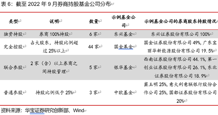 绝对控股基金公司占比较少,仅靠参股难实现公募业务转化。如前所述,申请公募牌照需要突破证券公司传统私募管理模式,增加权益类投研能力,面临监管的诸多问询和整改,相比之下以参股控股现有的基金公司的方式入局,只要有足够的资本条件即可实现,可以作为股东带动和基金公司的更多机构类业务合作,方便深入了解基金公司公募产品投研运作方式。但是弊端就在于无法根本解决牌照“卡脖子”问题。根据Wind数据,截至2022年9月,除了12家以券商或券商资管子公司获得牌照的机构外,其余58家券商持股的基金公司中仅6家为券商100%绝对控股,剩下的52家仅作为参股入股,无法实现借助参股公司的公募牌照将旗下管理的产品移交,也就是说通过参股控股的路径可以带来营收增长点的扩充,但无法实现自身资产管理业务的公募化,不是长期优选。