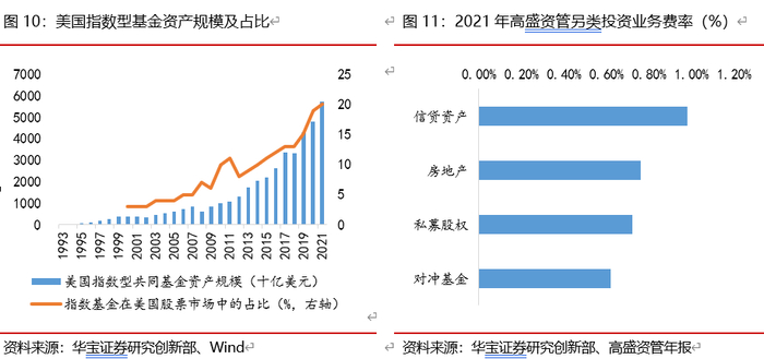 同时在资管产品供需端叠加双重加持,供给端受益于婴儿潮一代的年龄步入中青年阶段,完成财富初步累积,高净值人群增加;产品端不断创新,在2000年之后出现从主动型往被动型产品转变的趋势,截至2021年底,指数型共同基金资产规模超过5.74万亿美元,占股票市场比例逼近20%,理财产品的多样化伴随客户个性需求持续拓展。