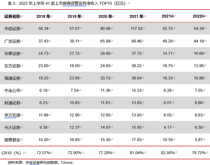 券商资管业务仍有延续马太效应的态势,从上市券商的资管业务净收入窥见一斑,2022年上半年41家A股上市券商中共有24家券商资管业务净收入同比增加,资管业务净收入超过10亿元的共5家,前十名的资管净收入集中度略有下降,但仍保持在80%左右,“二八分层”的行业模式持续。而且在资管子公司设立方面,借鉴海外经验,投行类证券公司为了提升在资产管理、财富管理业务的专业度和运转效率,往往都设立资管子的模式剥离客户资产服务业务,根据证监会关于证券公司子公司设立的要求,小券商在没有达到资管行业规模、营收平均水平以上时,很难获批设立资管子公司。而当头部资管子公司的设立批复后,未来资管行业的头部效应预计会更加显著。
